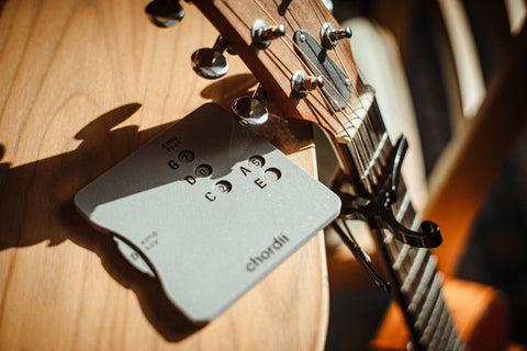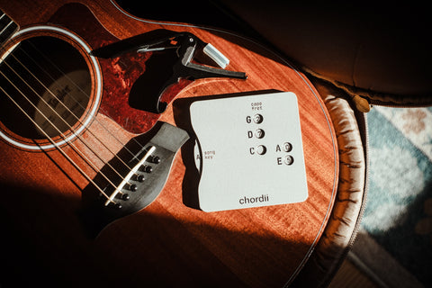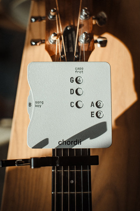 The Chordii Capo Companion is a small rotating capo guide that helps guitar players quickly see where to place a capo so they can stay in familiar chord families like G, C, D, A, and E.